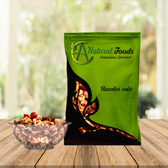 Rumba mix contiene (Mani natural tostado sin sal, Arandanos deshidratados y garbanzon fritos con sal)